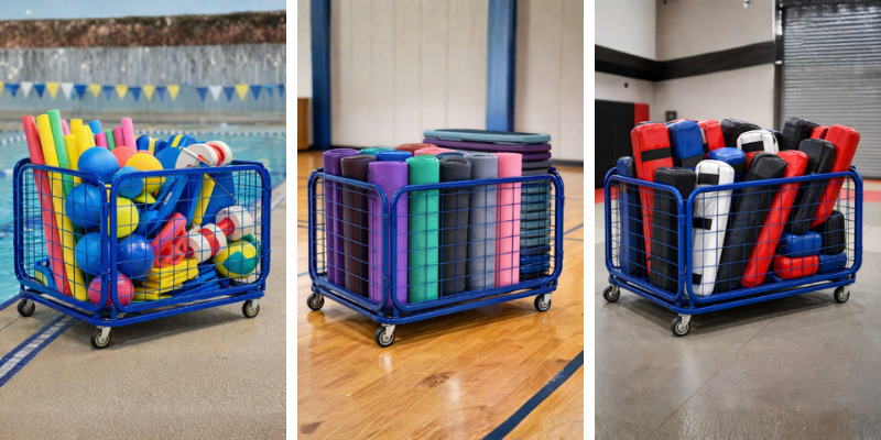 ale również na basenach, gdzie może służyć do przechowywania akcesoriów pływackich, takich jak piłki do aqua fitnessu, makarony, deski, pianki czy inne lekkie elementy treningowe.